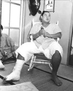 ![]() Maenoyama Tarō, just promoted to ōzeki, have to sit out his first tournament at this rank because of a broken right ankle (1970) | |