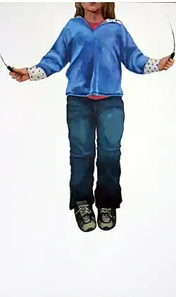 Magda Bielesz art is about subjects such as promise of happiness, life vitality, but also the problems of impaired body, old age – subjects not present in society communication, thus excluded. In terms of the artist, they regain their place in the natural cycle of life. In the Magdy Bielesz works, there is the hope and joy of life, often revealed in the children's fairy tale stylization.[5] In her works she is dating back to the memories and dreams, relationships, health-illness relation. She would like to find and fix all the deficiencies and damages. Delving into the world of childhood improves memory, which often differ from the actual situation. Referring to childhood, she creates a kind of un growing mythology. The most recognizable series are: Maszyny, Lekcja pływania i Dzieci.[1] As Bielesz sayes: In every area of my life I try to take from reality just as much as I need at the moment. I paint what I always missed, through my paintings fulfilling my dreams.[6] Her paintings are very clean - one item or a single person on a white background. Joining to one another, creating an endless spatial arrangement.[2] Often it goes beyond the image - a series of children on jumping ropes seems to jump out of the images. In the Room project, she made the first intervention in the architectural space of her studio (Night of Museums, 2009), and then in the extended version in spaces of Laznia Centre for Contemporary Art in Gdansk (2010). Thanks to the black line, new architectural elements are appearing, which she considered as missing, thus invites the viewer's imagination to run, crossing the physical barriers and symbolic passing through the wall.[7] Bielesz also creates video works that are very similar to painting. Videos can be divided into two groups: one is a documentation of events, images that she records (Dobro, 100 obrazków, Chwilami nierealności), the other is as she says are paintings that are moving[8] (Lekcja pływania, Złość piękności szkodzi, Gimnastyka). From Magda images raises fascination on the states that she is not able experience.[9] On her paintings she often marks objects and characters by depriving them of light and shade and putting them on a neutral white background. This creates the illusion of their own lives, outside of context meanings, which they originated.[10] This latter also applies to objects - talismans, which play an important role in her work. Bielesz creates them in short bursts: Poduszki do pływania we śnie,[11] Universal memory (sachets of plant seeds),[12] Universal dreams (sachets of seeds of plants),[13] Universal Wish (sachet of pills: Meet ET, Sing as Johnny Cash, be lucky, change sperm taste - carrot, be born again, clone yourself etc.),[14] KLOCKI, czyli zestaw do kreatywnego spędzania czasu[15] and Crystal.[16]
