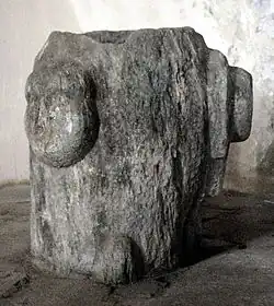 The central mountain hill was also taken over by Slavs / Carantanians as a religious centre. Namely, Pavle Zablatnik, a local ethnologue, identified the pilgrimage on four hills departing of the peak of the Magdalensberg-mountain as being pre-christian, so it had to be first inculturated in to the Slavic culture before being practiced today. Also, the three headed stone of Magdalensberg is said to be a major example of early Slavic art from the 8th. to the middle of the 9th Century that represents at its perfection the process of Inculturation of the Slavic main divinity Triglav (the three headed god), as it would otherwise be destroyed during the early phase of christianization of the Slovenes.[14] Numerous vestiges of Slovenian cultural history are still present, though the language became clearly a minority language.[15][16][17]