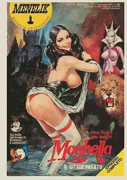 She made her first appearance as lead character in the erotic series Menelik published in 1974 by Publistrip.[3] The Maghella comic book was started in January 1974,[4] lasting for 140 issues published by Publistrip until March 1981. Later on, 7 issues were published by Ediperiodici from June 1987 to December 1987. The comic books were published also in France.[5][6]