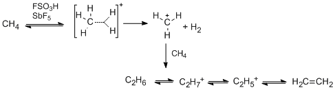 - ^ a b Olah, G. A.; Schlosberg, R. H. (1968). "Chemistry in Super Acids. I. Hydrogen Exchange and Polycondensation of Methane and Alkanes in FSO3H–SbF5 ("Magic Acid") Solution. Protonation of Alkanes and the Intermediacy of CH+