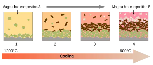 When crystals separate from a magma, then the residual magma will differ in composition from the parent magma. For instance, a magma of gabbroic composition can produce a residual melt of granitic composition if early formed crystals are separated from the magma.[92] Gabbro may have a liquidus temperature near 1,200 °C,[93] and the derivative granite-composition melt may have a liquidus temperature as low as about 700 °C.[94] Incompatible elements are concentrated in the last residues of magma during fractional crystallization and in the first melts produced during partial melting: either process can form the magma that crystallizes to pegmatite, a rock type commonly enriched in incompatible elements. Bowen's reaction series is important for understanding the idealised sequence of fractional crystallisation of a magma.[89]