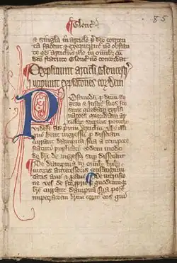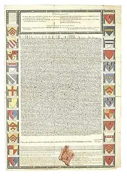 John held a council in London in January 1215 to discuss potential reforms, and sponsored discussions in Oxford between his agents and the rebels during the spring.[20] Both sides appealed to Pope Innocent III for assistance in the dispute.[21] During the negotiations, the rebellious barons produced an initial document, which historians have termed "the Unknown Charter of Liberties", which drew on Henry I's Charter of Liberties for much of its language; seven articles from that document later appeared in the "Articles of the Barons" and the subsequent charter.[22][23][24]