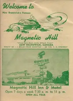 With the rise in tourism after the Second World War, the roughly 1 kilometre segment of gravel road became one of Moncton's prime tourist attractions (along with the tidal bore on the Petitcodiac River). Magnetic Hill is now a historic property.[1]