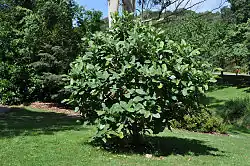 Magnolia delavayi is a small evergreen tree 8–15 metres (26–49 ft) in height with gray to grayish-black bark. The leaves are ovate to ovate-oblong, 10–20 cm (rarely to 32 cm) long and 5–10 cm (rarely to 20 cm) broad, tough, leathery, with a 5–7 cm petiole.[1]