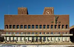 Magnus Poulsson is most famous for designing the Oslo City Hall, together with Arnstein Arneberg.[2] He is also known for his work on Bærum City Hall (Bærum Rådhus) in Sandvika (1925 and 1958), KNA Hotel in Oslo (1931), Eystein church in Hjerkin and Haslum Chapel in Bærum. Poulsson's work also included private residences, office buildings, churches and interiors. Magnus Poulsson was particularly known for recreating the tradition of Norwegian folk wooden architecture.[3]