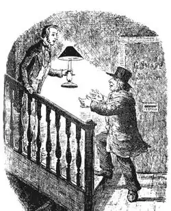 Dickens visited Portsmouth in the late 1850s to look for his birthplace. He is said to have been unsuccessful. However, the 1861 census[3] (£) lists a "Pheeary Madgwick" living next door to Dickens' childhood home (the address then was 393 Commercial Road).[4] Madgwick was cook to the Baker family, who ran a grocery business in the city. He is recorded as being 24 years old, unmarried and born in Midhurst, Sussex. There is a possibility that Madgwick produced a good meal for Dickens and was honoured with the namesake character Magwitch.