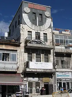 Mahane Yehuda is home to eight synagogues.[2] These include the landmark Zoharei Chama Synagogue ("Sundial Building"), which is open for prayer services throughout the day.[14] The three-story stone building with a wooden attic (originally there was also a fifth-floor gallery) was constructed atop a Mahane Yehuda apartment purchased by Shmuel Levy in the early 1900s; the building was originally designed as a hostel for 50 guests with the synagogue on the third floor.[15]