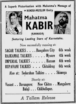 Mahatma Kabir (ⓘ) is a 1947 Indian Kannada-language film directed by R. Nagendra Rao.[1] He also stars in the lead role alongside Subbaiah Naidu. The film deals with Mahatma Gandhi's vision of harmony between the Hindus and Muslims. It was set in the backdrop of the religious violence in India that took place after the Independence from the British rule.[2]