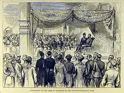 At the age of sixteen, Salar Jung I began introducing Mahboob Ali Khan to the administrative processes of the state. The highest-ranking officials of various departments would meet him to teach how their respective departments worked.[8] The regency of Salar Jung I and Shams-ul-Umra III ended when Mahboob Ali Khan came out of age. His investiture ceremony took place on 5 February 1884. Lord Ripon, the Governor-General of India, was present and gave him a golden sword, which was studded with diamonds.[6] Mahboob Ali Khan took the title His Exalted Highness Asaf Jah, Muzaffar-ul-Mulk, Nawab Mahbub Ali Khan Bahadur, Fateh Jung.[9]
