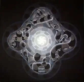 In Munich, in the 1960s, he was influenced by Constructivism, and with his Indian background, by Tantra art. Out of these origins arose his "Centrovision" series, which – already in 1990 – consisted of more than 3000 works. [1]
