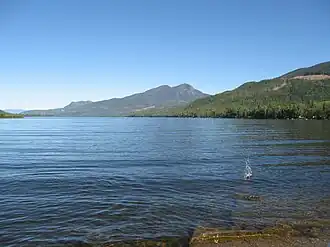 The lake is 630 metres in elevation, 208 metres deep at its deepest point, approximately 33.5 km² in area, 21 km (13.0 mi) in length (east to west) and a maximum of 2.2 km (1.4 mi) in width. Mount Mahood is immediately south of the lake and rises to 1,812 m (5,945 ft).
