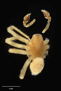 The male is recorded at 2.56mm in length. The cephalothorax and legs are coloured pale yellow. The abdomen is creamy.[1]