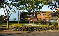 Maidashi Ryokuchi was designed as a children's playground with a public water fountain, playing equipment, and a nature trail.[3] The barrier-free nature trail provides a recreation area for older people and for students from the nearby Fukuoka Junior High School. Located near Yume Town Hakata, it is overlooked by the local intermediate school and provides a safe place for children to play. It is the biggest of the ten public parks in the Maidashi school district.[3]