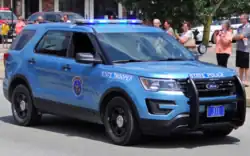 - Ford Police Interceptor Sedan and in both marked and unmarked versions. The marked versions are a dark sky blue. Unmarked cars are a variety of colors.
