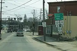 SR 11 and SR 121 proceed out of town to the southeast (both signed as "north"), meeting the southern terminus of SR 119 before entering Auburn and proceeding towards downtown on Minot Avenue. At the intersection of Minot Avenue and Rotary Street (the latter of which also carries southbound US 202, SR 4, and SR 100 on a one-way pair), SR 11 and SR 121 turn north on Washington Street (joining US 202, SR 4, and SR 100). Prior to 2023, this intersection was signed as the northern terminus of SR 121. Continuing north, Washington Street meets the southbound lanes at Minot Avenue, then reaches the intersection of Court Street, Union Street, and Minot Avenue,[1] where the SR 121 designation officially ends. SR 4 continues straight onto Court Street while US 202, SR 11 and SR 100 turn east onto Union Street towards Lewiston.