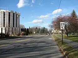 The signed eastern terminus of SR 25 is at the end of Deering Avenue at Park Street (SR 22). However, state route logs indicate SR 25 continuing along SR 22 to terminate at State Street (SR 77). Both SR 22 and SR 25 officially terminate at SR 77, but SR 25 is not signed at the intersection.