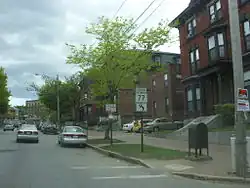 Upon entering Portland proper, SR 77 crosses over U.S. Route 1A (US 1A) with indirect access available via connecting streets. The highway splits into a one-way pair, High Street northbound and State Street southbound. The SR 77 designation continues north for another 0.9 miles (1.4 km) before terminating at Park Street. This intersection is the signed eastern terminus of SR 22, and administratively SR 25, although the latter is not signed.[2] In addition, the highway also passes Cumberland Avenue just to the south, the former southern terminus of SR 26. The one-way northbound alignment of SR 77 on High Street is not officially part of the route as designated, because State Street was formerly a two-way street prior to 1972.[3]