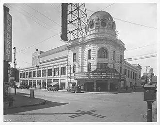 ![]() The Mainstreet Theater as it originally appeared, prior to several name changes and removal of the large sign suspended from the roof | |