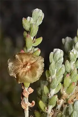Maireana appressa, commonly known as grey bluebush,[2] is a species of flowering plant in the family Chenopodiaceae and is endemic to Australia. It is an intricately branched, spreading or erect shrub covered with woolly, white hairs with narrowly triangular to narrowly oblong leaves, bisexual flowers arranged singly, and a top-shaped fruiting perianth with horizontal wings.