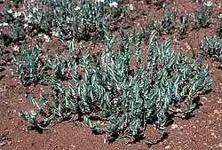 Maireana carnosa, commonly known as cottony bluebush,[3] is a species of flowering plant in the family Chenopodiaceae and is endemic to continental Australia. It is an erect to spreading or prostrate perennial herb or subshrub with a woody base, fleshy narrowly to broadly oblong leaves, bisexual flowers arranged singly, and a crust-like, hemispherical fruiting perianth with a thin, horizontal wing.