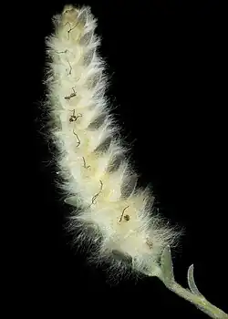 Maireana carnosa is an erect to spreading or prostrate perennial herb or subshrub that typically grows to a height of 30 cm (12 in) and has a woody base. Its leaves are narrowly to broadly oblong or broadly elliptic to lance-shaped, 4–12 mm (0.16–0.47 in) long, 1.5–3.5 mm (0.059–0.138 in) wide and usually covered with silky to woolly hairs. The flowers are bisexual and usually arranged singly in leafy spikes covered with woolly tufts. The fruiting perianth is sessile, 8 mm (0.31 in) covered with wool, the tube crust-like, hemispherical and 2–3 mm (0.079–0.118 in) in diameter with a circular wing about 0.5 mm (0.020 in) wide with a radial slit.[4][5][6][7]