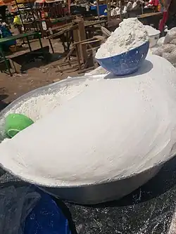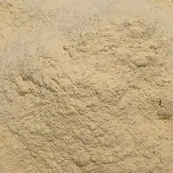 Maize flour or corn flour is a flour ground from dried maize (corn).[1][2] It is a common staple food, and is ground to coarse, medium, and fine consistencies. Coarsely ground corn flour (meal) is known as cornmeal.[3][4] When maize flour is made from maize that has been soaked in an alkaline solution, e.g., limewater (a process known as nixtamalization), it is called masa harina (or masa flour), which is used for making tamales and tortillas.[5] Arepas are typically made from corn flour that has not been nixtamalized.