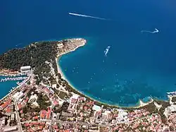 Makarska is a prominent regional tourist center, located on a horseshoe-shaped bay between the Biokovo mountains and the Adriatic Sea. The city is noted for its palm-fringed promenade, where cafes, bars and boutiques overlook the harbor. Adjacent to the beach are several large capacity hotels as well as a camping grounds.