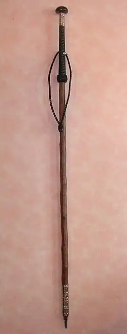 The makila walking stick consists of an engraved medlar wood shaft cut to a length to suit its owner, generally either hipbone or sternum-height, 1 to 1.4 metres (3.3 to 4.6 ft). The bottom is often shod with steel or other metal and ends in a ferrule (blunt spike for traction). The handle is also often covered with metal or woven leather to form a hand-grip, with a lanyard attached to the bottom of this grip. The stick is capped with a flattened knob or pommel, made of horn, steel, or bronze. The top portion consisting of the knob and hand-grip can be pulled off the top of the stick, revealing a hidden spike or blade, which effectively turns the stick into a short spear. The pommel's shape is said to resemble the beret worn by the Basque shepherd.