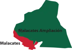The original Malacates neighborhood is much smaller and more southern, bordering Colonias Lomas de Cuautepec and Parque Metropolitano to the south, Colonia Verónica Castro to the east, and La Ponderosa section of the Sierra de Guadalupe to the west.