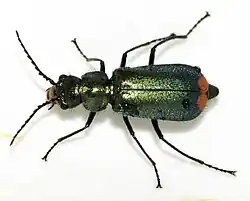 The most common North American species belongs to the genus Collops (C. quadrimaculatus) and is reddish, with two bluish black spots on each elytron.[1]