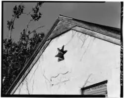 Between 1930 and 1950, an extension comprising a living and sitting room was integrated into the 1869 structure. The main floor has served as a living space and is sectioned into three rooms by wooden partitions, which do not seem to be part of the original structure. All four interior walls have been plastered, and the floor is composed of 2 inches (50.8 mm)-wide soft wooden boards. On the main floor's west-facing facade, there are two one-over-one sash windows. There's also a star-shaped unglazed opening in the gable of this facade, likely designed for attic ventilation. Below the star is a cartouche that bears the initials "C-M" and the date 1869. Given that Malaguerra's wife was Alvina Collins, it's plausible that these initials "C-M" could represent their combined monogram.[1]