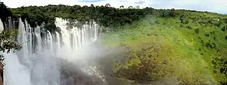 The Malanje Province is located in the north of Angola, the provincial capital and largest town of Malanje located 383 kilometres (238 mi) by road east of the national capital of Luanda.[3] It is bordered to the northwest by Uige Province, to the northeast by the Democratic Republic of the Congo, to the east by Lunda Norte Province and Lunda Sul Province, to the south by Bié Province and Cuanza Sul Province, and in the west by Cuanza Norte Province. The extreme north of the province is covered with savannah, while the southern part is largely dry savannah. The main rivers are the Cuanza River in the southwest and Kwango River in the northeast, and there is a mountainous area known as the Malanje Plateau.[4] The Cuije River and Cuanza flow in the vicinity of Cangandala National Park.[5] Large areas north and southeast of the city of Malanje have been declared protected areas. Of note is the Milando Reserve Park (Reserva Especial do Milando) in the north and the Reserva Natural Integral do Luando at the headwaters of Cuanza.[3]