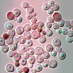 - ^ Xu J, Saunders CW, Hu P, et al. (November 2007). "Dandruff-associated Malassezia genomes reveal convergent and divergent virulence traits shared with plant and human fungal pathogens". Proc. Natl. Acad. Sci. U.S.A. 104 (47): 18730–5. Bibcode:2007PNAS..10418730X. doi:10.1073/pnas.0706756104. PMC 2141845. PMID 18000048.