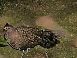 The Malayan peacock-pheasant (Polyplectron malacense)[3] also known as crested peacock-pheasant or Malaysian peacock-pheasant, is a medium-sized pheasant of the galliform family Phasianidae. The closely related Bornean peacock-pheasant (P. schleiermacheri) was formerly included here as a subspecies, but as understood today, P. malacense is monotypic.[4]