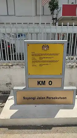 The Kilometre Zero of the Federal Route 5 is located at Skudai, Johor, at its interchange with the Federal Route 1, the main trunk road of the central of Peninsular Malaysia. It begins as an east–west highway from Skudai to Pontian Kechil. Starting from Pontian Kechil, it becomes the main west coastal trunk road of Peninsular Malaysia.[5] At Batu Pahat, the FT5 highway forms a part of the Batu Bahat–Kluang Road from Banang Roundabout to Mount Soga Intersection, but was signed as FT5; the Batu Pahat–Kluang Road assumes the FT50 designation from Mount Soga Intersection onwards. At Mount Soga Intersection, the FT5 highway is diverted to Jalan Peserai FT5 that forms the Muar–Batu Pahat Road FT5 to Parit Jawa.[6] At Parit Jawa, the FT5 route is diverted to Jalan Abdul Rahman FT5 to Muar, where it passes three roundabouts (Khalidi Roundabout, Sulaiman Roundabout and Bentayan Roundabout) before the FT5 route is diverted once again to Jalan Bakri FT5 at Bentayan Roundabout, which later continues as the Sultan Ismail Bridge FT5 and Jalan Kesang FT5.[7]