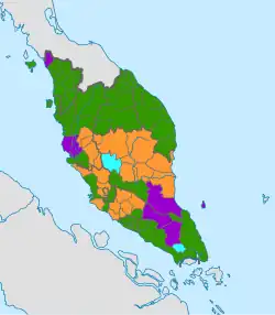 Cantonese is widely spoken amongst Malaysian Chinese in the capital Kuala Lumpur[1] and throughout much of the surrounding Klang Valley (Petaling Jaya, Gombak, Ampang, Cheras, Rawang, Putrajaya, Selayang, Sungai Buloh, Puchong, Shah Alam, Kajang, Bangi, Semenyih and Subang Jaya) excluding Klang itself where Hokkien predominates. It is also widely spoken in the town of Sekinchan in the Sabak Bernam district of northern Selangor. It is also used or widely spoken in northeast and central areas as well as parts of southern Perak, especially in the state capital Ipoh and the surrounding towns of the Kinta Valley region (Gopeng, Batu Gajah and Kampar) as well as the towns of Tapah and Bidor in the Batang Padang district of southern Perak and to a lesser extent in the districts of Kuala Kangsar, Perak Tengah, Hilir Perak, Bagan Datoh and Hulu Perak (Cantonese of Kwongsai origins from Guangxi).[2][3][4] In Pahang, it is spoken in the state capital town of Kuantan and also widely found or spoken amongst the local Chinese populace in other districts such as Raub, Maran, Jerantut, Bentong, Rompin, Kuala Lipis, Bera, Pekan, Temerloh and Cameron Highlands.[5][6] Cantonese is also spoken throughout most of Negeri Sembilan, particularly in the state capital Seremban (but a lesser extent also widely spoken by the local Chinese in other towns of the state such as Jempol, Kuala Pilah, Tampin, Rembau, Port Dickson, Gemas and also Bahau with a special exception in Jelebu, where the Hakka dialect predominates mostly along with the towns of Nilai and Mantin, which are outer suburbs of Seremban city).[7] It is widely spoken in Sandakan, Sabah and Cantonese speakers can also be found in other areas such as Segamat, Johor, Keningau, Sabah, Sarikei, Sarawak, Batu Pahat, Johor, Miri, Sarawak and Mersing, Johor.[8]