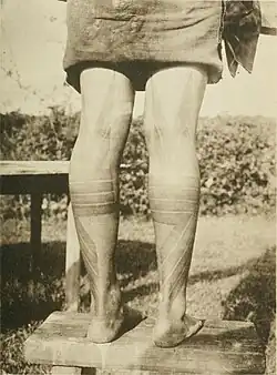 Tattoo: The Dayaks of Borneo are known for their traditional method of tattooing, a hand tapping style method using two sticks. According to the Dayak culture, different motifs are used for different parts of the body, where the purpose of the tattoos is to protect the tattoo bearer or to signify certain events in their life. One of the most important motifs of Iban tattoo includes bungai terung (Bornean eggplant flower), which is the first tattoo an Iban individual would receive to mark the Iban tradition known as bejalai. Bejalai is a journey of knowledge and wisdom, where an individual would leave their longhouse to experience the world.