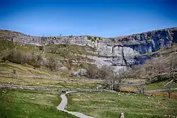 A stream named Malham Beck originates on Malham Moor and emerges from a cave at the bottom of the cove. This is a different stream from the stream that flows out of Malham Tarn 1.5 mi (2.4 km) north of the cove. This latter stream goes underground at 'Water Sinks' about 1 mi (1.6 km) before the top of the cove and does not emerge until Aire Head, south of Malham.[1] The two streams were once thought to be one and the same, but experiments with dyes have shown that they are two separate waterways that go underground at different places. Their routes cross, without their waters mixing, behind the limestone cliff, re-emerging a few miles apart; indicating that there is a complex cave system behind the limestone cliff. Cave divers, entering the system through the cave at the base of the cove, have so far explored about 1 mi (1.6 km).[2] Stalagmite deposits inside the rising, dated to at least 27 ka, imply that the cave was dry during the Devensian ice age, and so must have been formed before then.[3] The cave systems usually carry away any water before it reaches the fall; however, Malham Cove temporarily became a waterfall for what is believed to be the first time since 1824 on 6 December 2015, after heavy rainfall from Storm Desmond.[4][5][6]