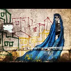 Malina's art didn't become political until she moved back to Afghanistan. After seeing the discrimination she and other women faced, Suliman's art sought to advocate for women's rights in Afghanistan. Her most famous graffiti art is the image of a skeleton wearing a blue burqa. Suliman always felt like the burqa controlled her as child. To Malina, the skeleton is a self portrait that means a lack of identity for women in Afghanistan, inequality because women are treated as second class citizens in Afghan, and oppression for the women who are killed asking for rights. One of her more morbid and darker works includes a gruesome scene in the aftermath of a suicide bombing. Malina depicts the reaction of people in a statement during an interview. “Many people had never seen an art installation... Some were offended and others were hurt because they’d experienced it before."[10] Suliman's work is very personal as well. She experienced a suicide bombing at an exhibit but made it out safely without any injuries.