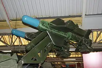 - Guidance: Wire guided MCLOS, using a thumb joystick and visual observation of two flares on the wings.
