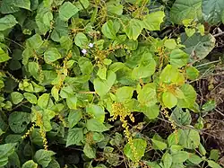 Mallotus repandus is an evergreen vine that may reach up to 20 m (66 ft) long and a stem diameter of up to 22 cm (8.7 in).[3][4][5] It is the only Mallotus species to grow as a liana.[6]: 23 Bark is dark brownish grey.[7] Branchlets, petioles and inflorescences are dull yellowish-brown. The blaze (longitudinal cut of the bark) is finely layered, with an odour of green peas (Pisum sativum). The simple and broad leaves are slightly peltate.[8] Flowers are yellowish. It flowers in China from March to May, and fruits from June to September. The species can be distinguished from other Mallotus species, by its being a climber and that its upper leaf surface have more than 2 marginal extrafloral nectaries, and that its fruits are (1-or) 2- or 3-locular.[7] A molecular phylogeny study has M. repandus as a sister species of M. phillippensis (Lam.) Muell.Arg.[9] The indumentum/hairs on the leaves of the plant are simple and multicellular, a trait only found amongst the Mallotus genera in the closely related M. philippensis.[6]