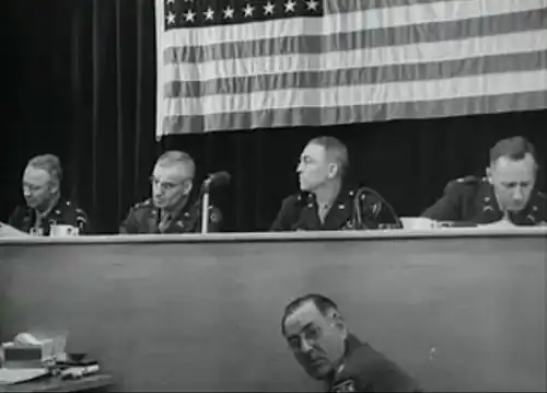 Joseph McCarthy (R-WI) had obtained from the subcommittee's chairman authorization to attend the hearings. McCarthy's state, Wisconsin, had a large population of German heritage, spurring allegations that McCarthy was politically motivated in his work on behalf of the Malmedy defendants.[23] He used an extremely aggressive questioning style during the proceedings.[24]