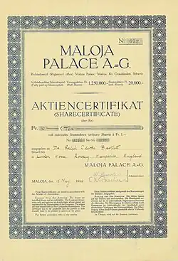 Camille Maximilien Frédéric, count of Renesse (9 July 1836 – 12 June 1904), built the hotel following the designs of Belgian architects Kuoni and Jules Rau in a Neo-Renaissance style; building commenced in 1882 and the hotel was opened on 1 July 1884.[1][2][3] Initially called "Hôtel Kursaal de la Maloja" it was renamed "Maloja Palace", becoming the first hotel to bear the name "Palace" at its time and the biggest and most modern hotel in the Alps.[3]