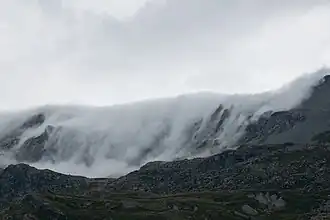 If the dew point in the Maloja Pass is met as a Maloja Wind passes, a low-lying cloud begins to form. The cloud takes on a narrow and elongated form as it is shaped by the walls of the valley, which shear and rotate its flow.[3] This phenomenon is known as the "Maloja Snake", so named because of the long, serpentine shape of the resulting cloud.[4] The Maloja Snake typically forms roughly 500 to 700 metres above ground level, and is roughly 50 metres thick. It travels through the Engadin and generally dissipates over Lake Sils and Lake Silvaplana, but can reach as far as St. Moritz.[3]