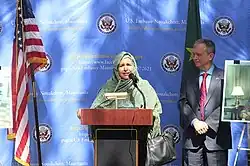 Malouma was decorated in 2013 as a Chevalier of the Legion of Honor by the French ambassador, Hervé Besancenot, acting on behalf of President Nicolas Sarkozy of France.[10][65] On January 20, 2015, Malouma, Mauritania's "singer of the people and Senator", was honored by the American ambassador, Larry André, at a lunch attended by notable leaders, especially women, from the country's civil society. Presenting Malouma with the Mauritanian Woman of Courage award, the ambassador noted her "exceptional courage and leadership in advocating human rights, women, gender equality and harmony amongst the cultural traditions of Mauritania".[66]