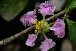 The tree flowers from April to November. Flowers are bisexual and 1–2 cm (0.39–0.79 in) in diameter. They have five[19] pale to deep pink or red[20] fringed petals, 10 stamens, and six to 10 glands on the calyx. The three to five flowers per inflorescence are sessile or short-peduncled axillary cymes.[17]
