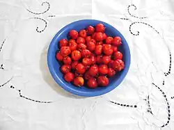 Common names include acerola (from Arabic: الزُّعرُورَة, romanized: az-zuʿrūra "azarole" for a similar looking old-world fruit[2][3]), Guarani cherry, Barbados cherry, West Indian cherry,[4] wild crepe myrtle,[5] cereza, and cerise.[6]