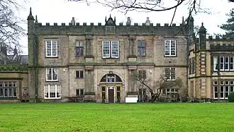 The building is constructed of sandstone with a pantile roof. The entrance front has two storeys and five bays, with a one-storey three-bay extension to the right, a two-storey two bay extension to the left, and later extensions further to the left. The middle three bays of the entrance front project, and have paired Tuscan and Doric columns, a moulded string course, a moulded eaves cornice and an embattled parapet flanked by ogee-headed turrets. In the centre of the front is a round arch with a keystone, and an inserted doorway and lunette. Most of the windows are mullioned, some with hood moulds, and in the centre of the parapet is a panel with a moulded surround. Inside, there are two 17th-century staircases and Jacobean woodwork including an elaborate fireplace.[2][4]