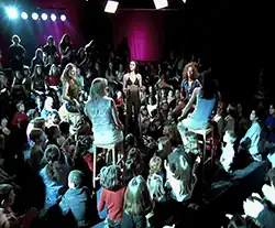 Whereas the re-edited version pans to the girls already sat in a circle on stage, along with a slide show displaying photos of the real band members as children. This version has Emma start the singing sitting down on her stool.